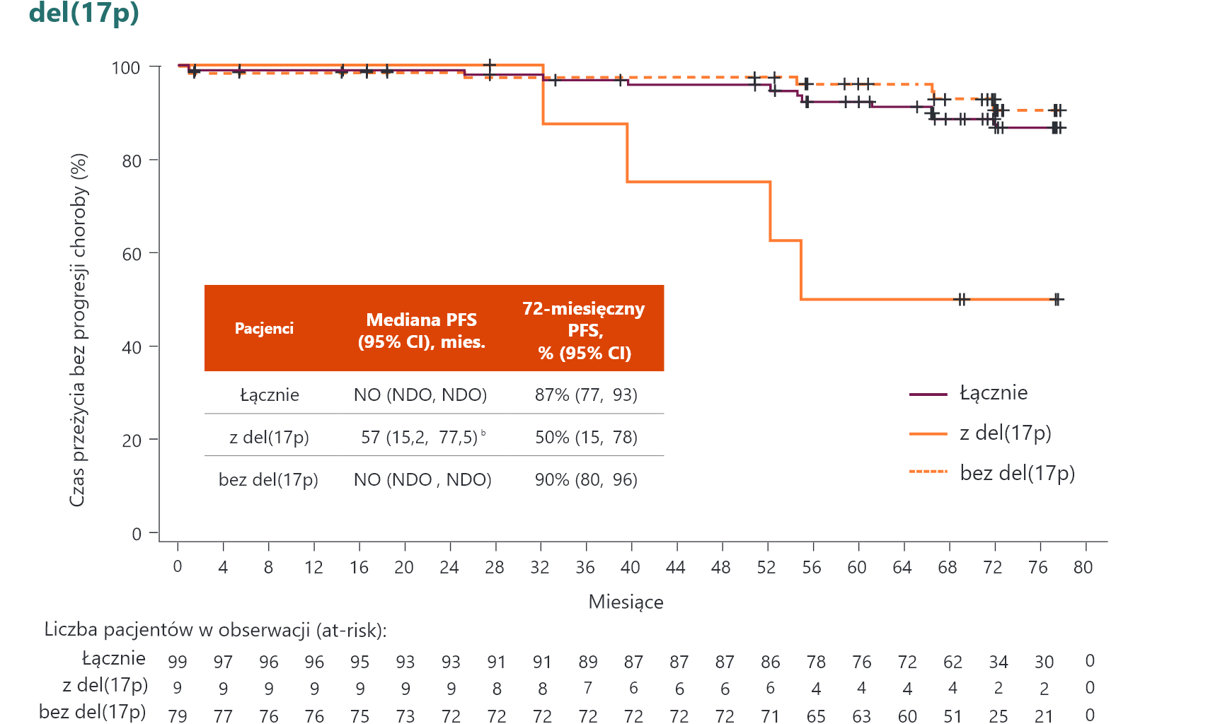 Pacjenci nie byli objęci obserwacją pod kątem PD, zgonu lub rozpoczęcia nowej terapii po odstawieniu akalabrutynibu. b Duże rozbieżności w szacunkach wynikają z ograniczonej wielkości próby. c Spośród 12 pacjentów z CK (≥3 nieprawidłowości) 5 miało również del(17p). CI (ang. confidence interval) – przedział ufności; CK (ang. complex karyotype) – złożony kariotyp; mies. – miesiące; NDO – niemożliwe do oceny; NE (ang. not estimable) – niemożliwe do oszacowania; NR (ang. not reached) – nie osiągnięto; NO – nie osiągnięto; PFS (ang. progression–free survival) – czas przeżycia bez progresji choroby.