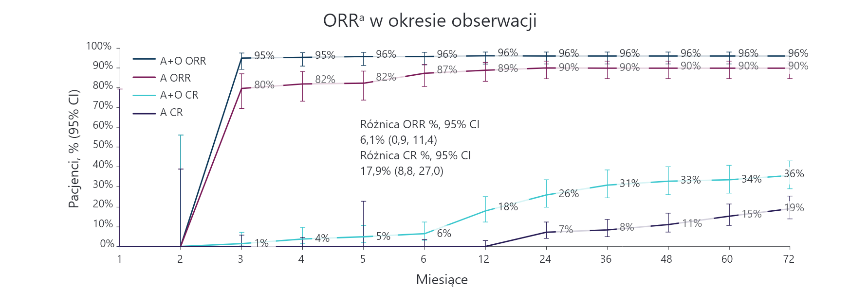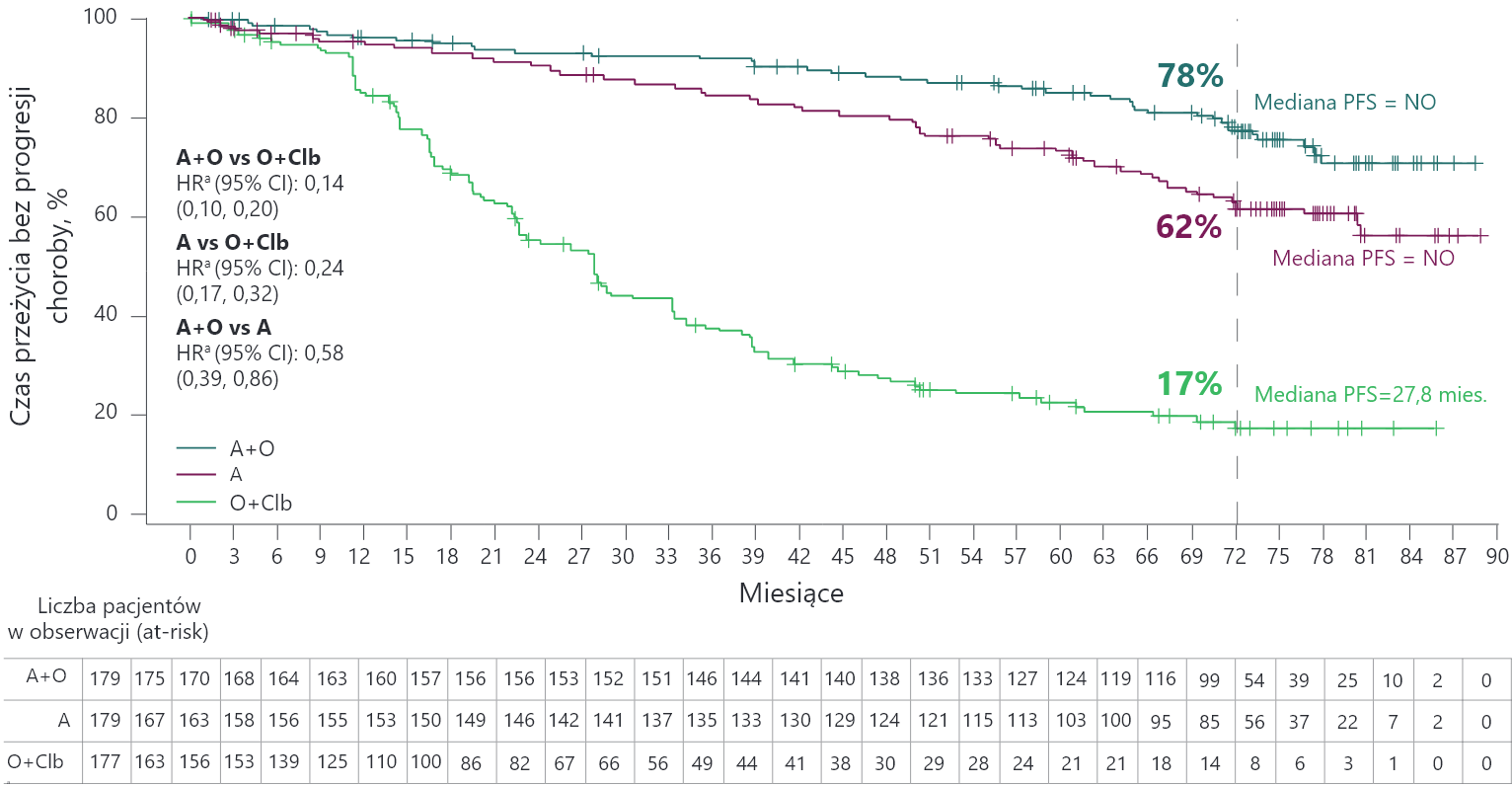 Mediana PFS nie została osiągnięta dla A+O i A vs 27,8 miesiąca dla O+Clb. Szacowany 72-miesięczny odsetek PFS wyniósł 78% dla A+O, 62% dla A w monoterapii i 17% dla O+Clb.
