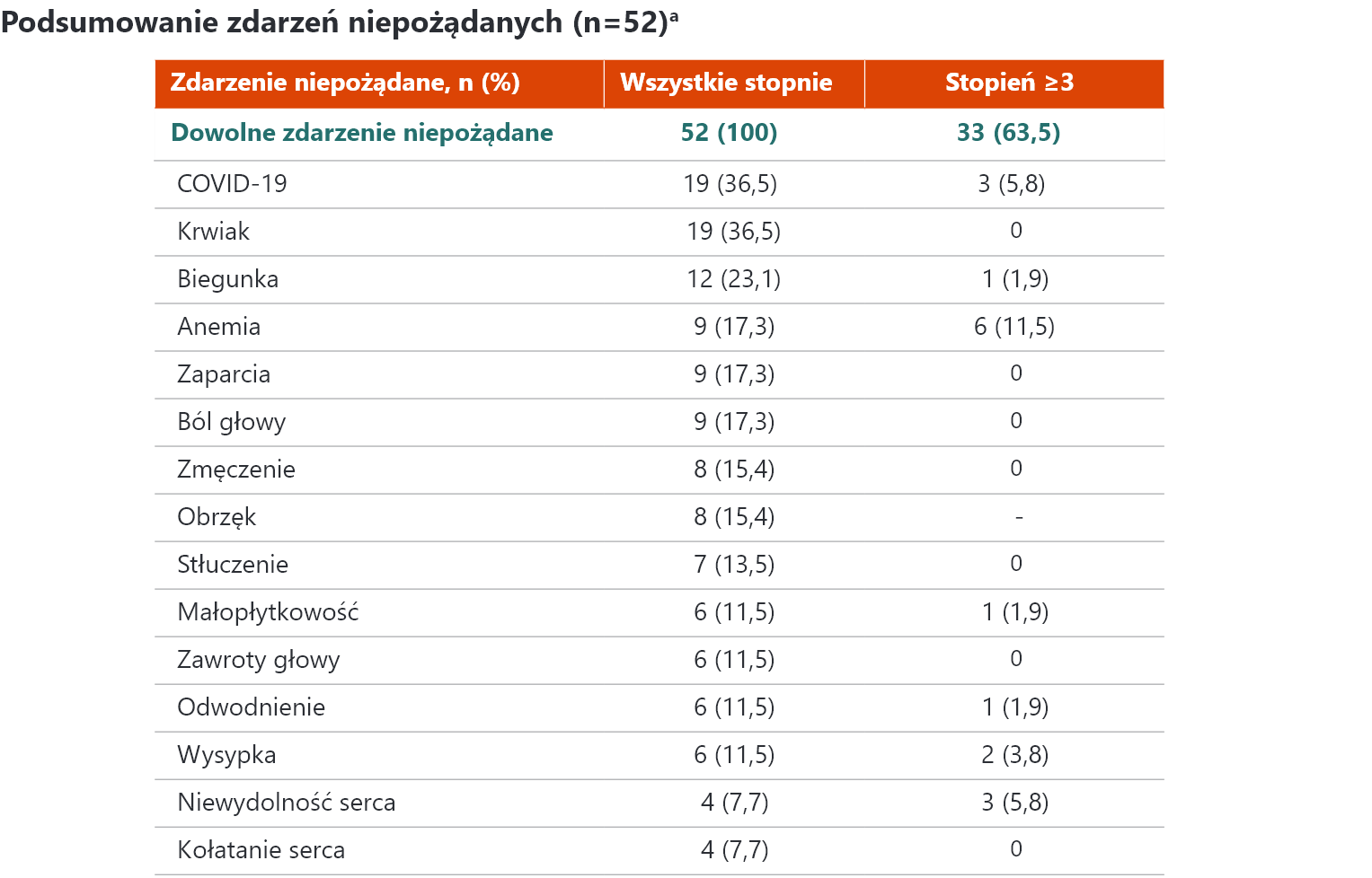 a Analizy na poziomie pacjentów były przeprowadzane dla pacjentów, wśród których występowanie wynosiło co najmniej 10%. Zobrazowano tylko częste zdarzenia