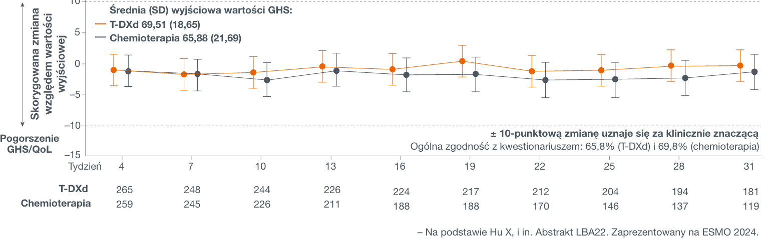 Słupki przedstawiają 95% przedziały ufności. Wartość wyjściową rozumie się jako ostatnią ocenę przeprowadzoną w dniu randomizacji lub przed nim, lub przed podaniem pierwszej dawki, jeśli ocena dostępna była dopiero po randomizacji. 1. Hu X, Curigliano G, Yonemori K, I wsp; DESTINY-Breast06 Investigators. Effects of trastuzumab deruxtecan vs choice of chemotherapy on patient-reported outcomes in hormone-receptor–positive, HER2-low or HER2-ultralow metastatic breast cancer: results from DESTINY-Breast06 [abstract LBA22]. Presented at: European Society for Medical Oncology; September 13-17, 2024; Barcelona, Spain.