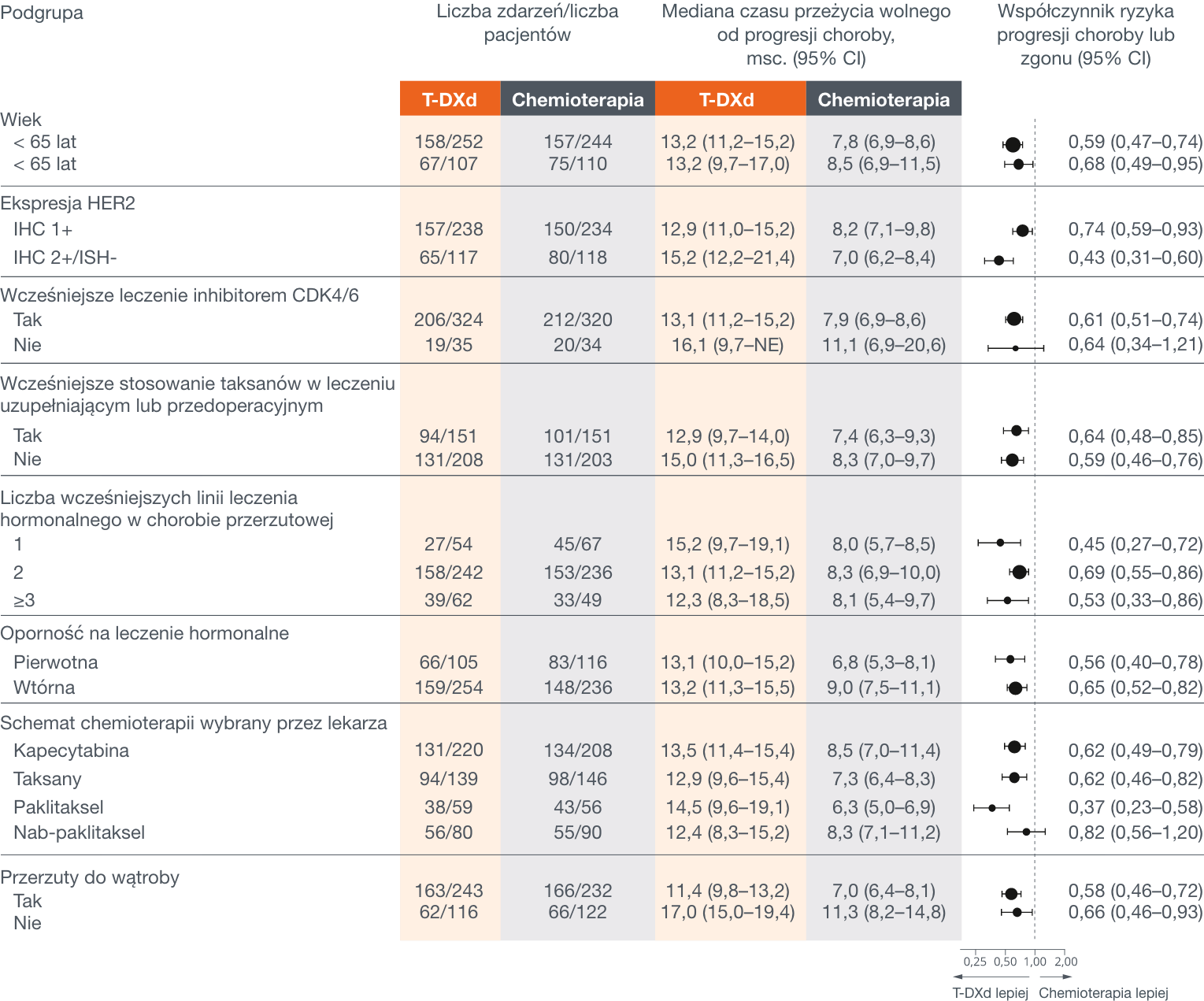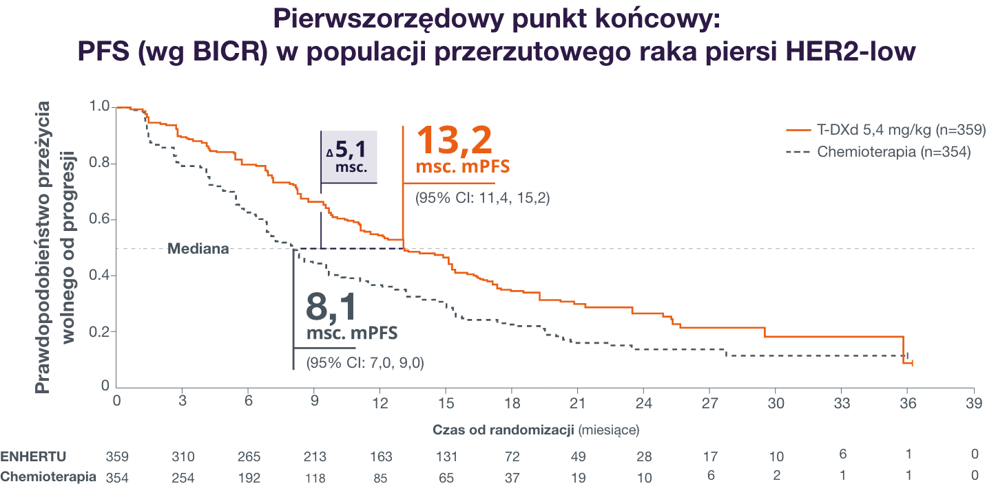 Mediana czasu trwania odpowiedzi na leczenie (mDOR) w przypadku T-DXd wyniosła 14,1 miesiąca w porównaniu do 8,6 miesiąca w grupie leczonej chemioterapią.1