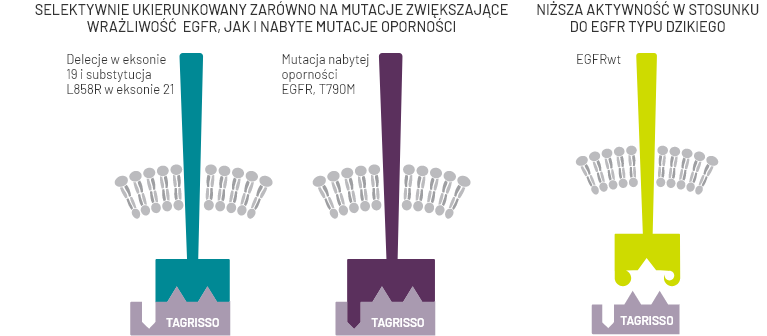 Tagrisso® jest inhibitorem kinazy tyrozynowej (ang. Tyrosine Kinase Inhibitor, TKI). Lek ten jest nieodwracalnym inhibitorem receptorów dla naskórkowego czynnika wzrostu (ang. Epidermal Growth Factor Receptors, EGFRs) z obecną mutacją w genie kodującym te receptory prowadzącą do zwiększenia wrażliwości (EGFRm) lub mutacją T790M warunkującą oporność na TKI.