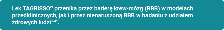*Opis badania: Ośmiu (8) zdrowych ochotników płci męskiej (w wieku 52 ± 8 lat) poddano badaniu przez ~ 90 minut z obrazowaniem PET po podaniu pojedynczej dożylnej mikrodozy (1,3 μg; zakres 1,1-1,4 μg) leku TAGRISSO® znakowanego izotopem węgla 11C. Stężenie leku TAGRISSO® znakowanego izotopem węgla 11C mierzono również we krwi tętniczej i żylnej oraz w osoczu. Wykonano MRI mózgu, który wykorzystano do współrejestrowania danych PET i automatycznego wyznaczania interesujących obszarów w mózgu. Obliczono parametry farmakokinetyczne Cmax (mózg), Tmax (mózg) oraz stosunek mózg/krew AUC0-90 min. Monitorowanie bezpieczeństwa i tolerancji obejmowało rejestrowanie zdarzeń niepożądanych, parametrów życiowych i EKG4.