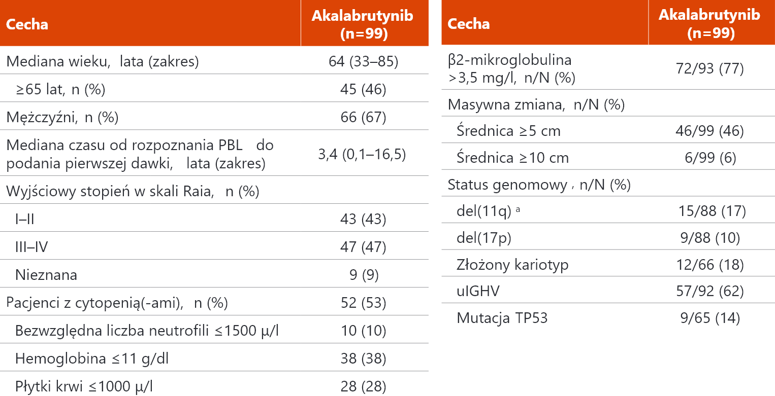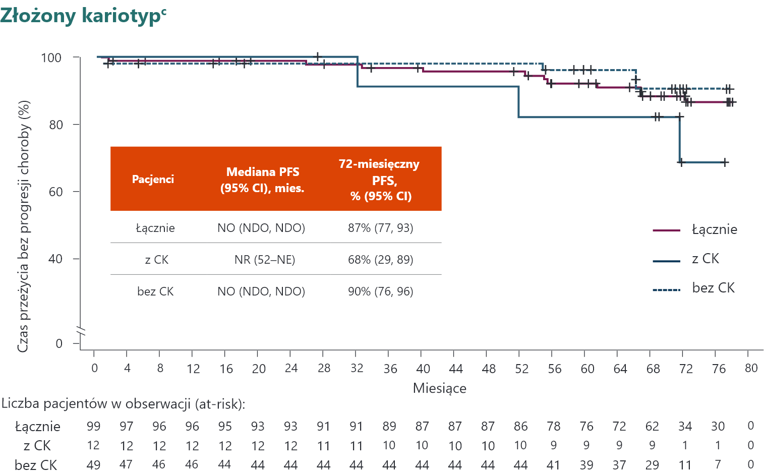 Pacjenci nie byli objęci obserwacją pod kątem PD, zgonu lub rozpoczęcia nowej terapii po odstawieniu akalabrutynibu. b Duże rozbieżności w szacunkach wynikają z ograniczonej wielkości próby. c Spośród 12 pacjentów z CK (≥3 nieprawidłowości) 5 miało również del(17p). CI (ang. confidence interval) – przedział ufności; CK (ang. complex karyotype) – złożony kariotyp; mies. – miesiące; NDO – niemożliwe do oceny; NE (ang. not estimable) – niemożliwe do oszacowania; NR (ang. not reached) – nie osiągnięto; NO – nie osiągnięto; PFS (ang. progression–free survival) – czas przeżycia bez progresji choroby.