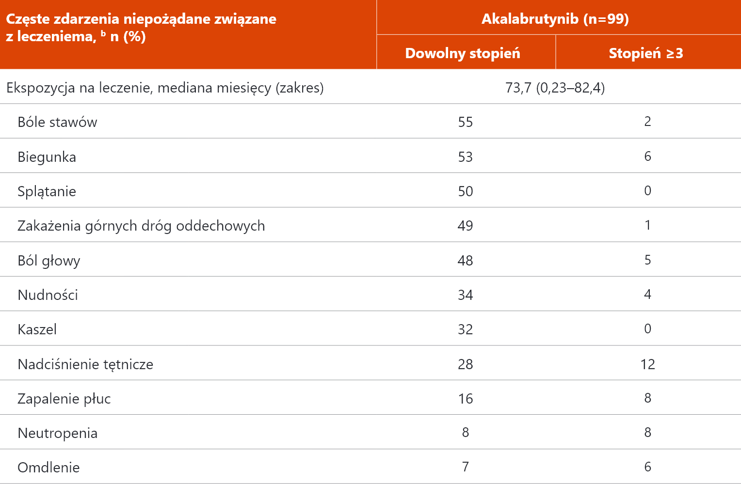 a Zdarzenia niepożądane dowolnego stopnia u ≥30% pacjentów leczonych akalabrutyniebem lub stopnia ≥3 u ≥5% pacjentów leczonych akalabrutynibem.