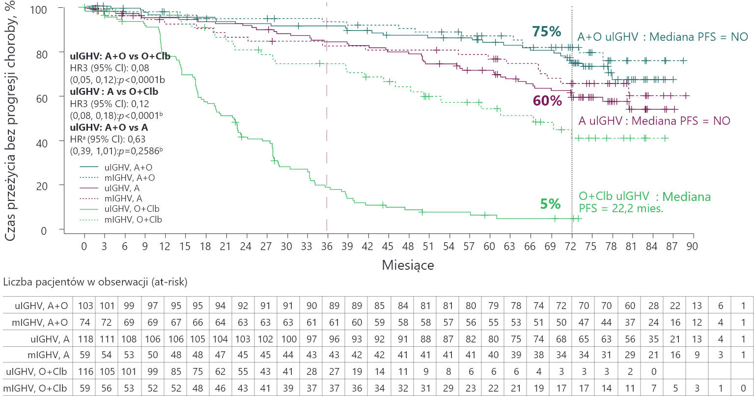 Mediana PFS nie została osiągnięta u pacjentów z uIGHV leczonych A+O i A w porównaniu z 22,2 miesiąca w ramieniu O+Clb.