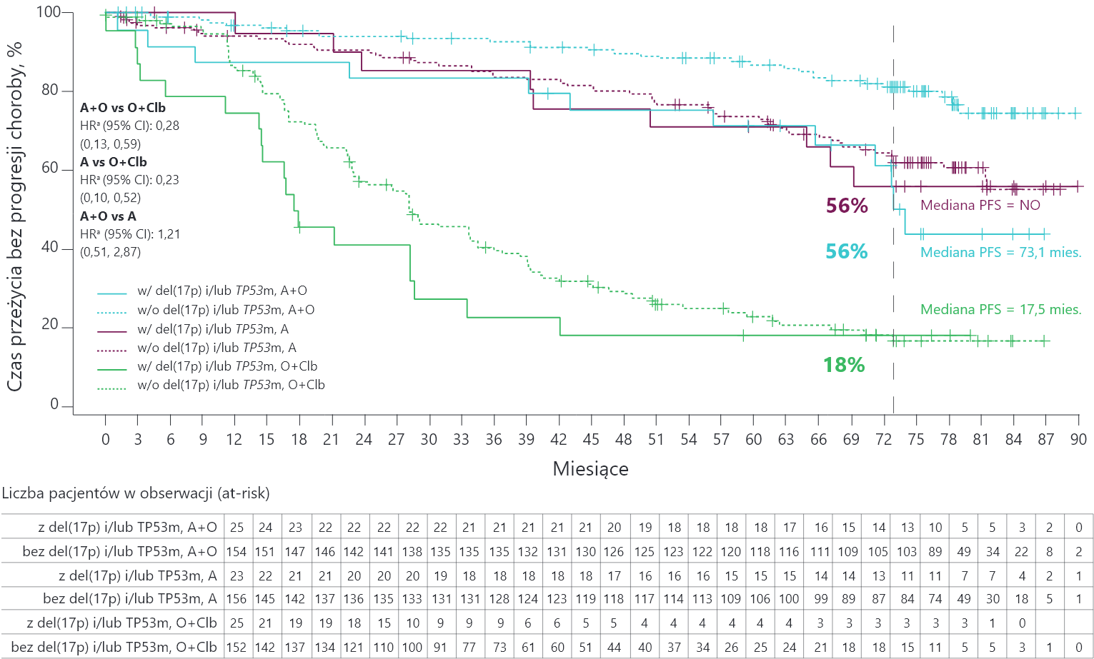 Mediana PFS była istotnie dłuższa u pacjentów z del(17p) i/lub TP53m leczonych A niż u pacjentów otrzymujących O+Clb.