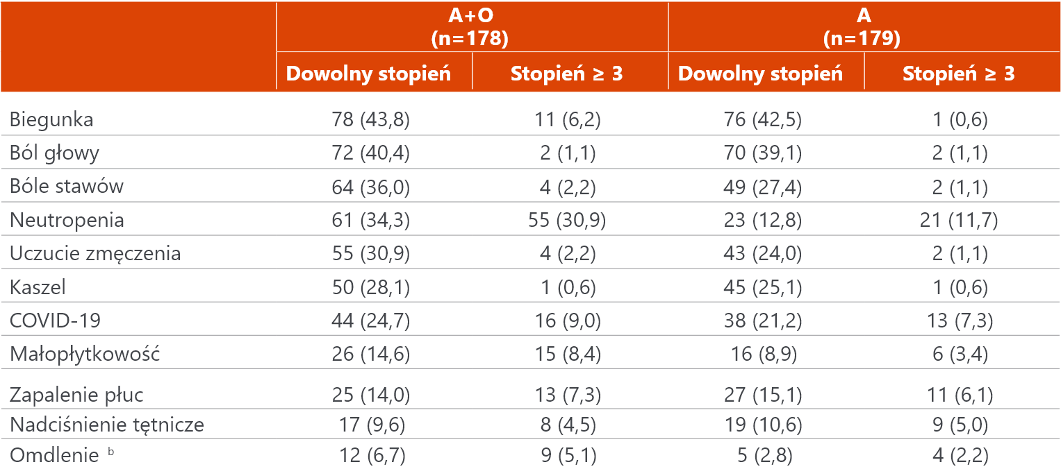 a Obejmuje TEAE dowolnego stopnia u ≥30% pacjentów i TEAE stopnia ≥3 u ≥5% pacjentów. b Wyłączono zdarzenia, dla których preferowane terminy to „wzrost masy ciała” (dowolnego stopnia zgłaszany u 33% pacjentów). TEAEs (ang. treatment emergent adverse events) – zdarzenia niepożądane związane z leczeniem.