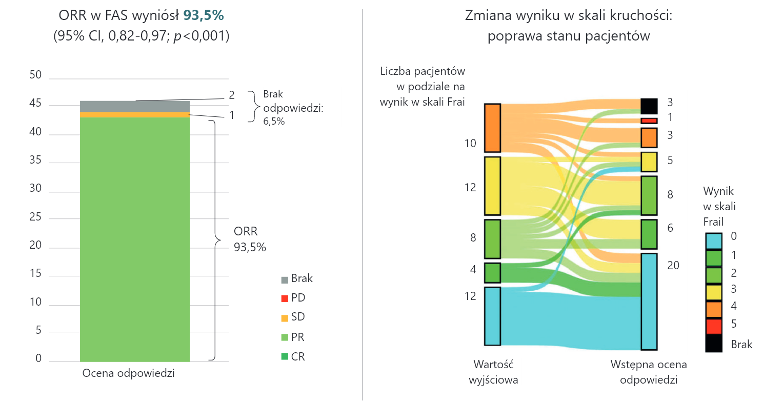 CR – odpowiedź całkowita; FAS – zestaw pełnej analizy; ORR – całkowity odsetek odpowiedzi; PD – progresja choroby; PR – odpowiedź częściowa; SD – stabilny przebieg choroby.