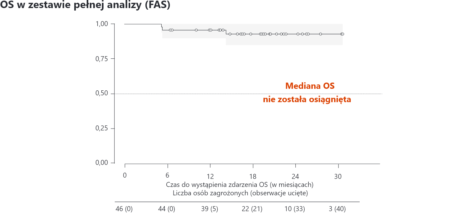 W analizie OS wśród pacjentów w FAS nie osiągnięto mediany OS. Szacowany 12-miesięczny odsetek OS wyniósł 95,7%3