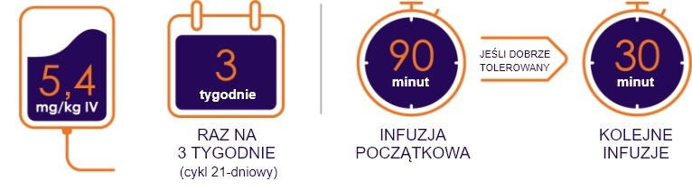 W przypadku opóźnienia lub pominięcia planowanej dawki, należy ją podać jak najszybciej; nie należy czekać do następnego planowanego cyklu. Należy dostosować schemat podawania, aby zachować 3-tygodniowy odstęp między dawkami. Podawać infuzję w dawce i szybkości tolerowanej przez pacjenta w ostatniej infuzji.
