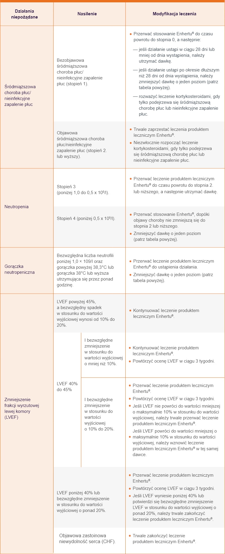 Postępowanie w przypadku działań niepożądanych może wymagać czasowego przerwania leczenia, zmniejszenia dawki lub zaprzestania leczenia produktem leczniczym Enhertu® zgodnie z modyfikacjami dawki podanymi w poniższych tabelach