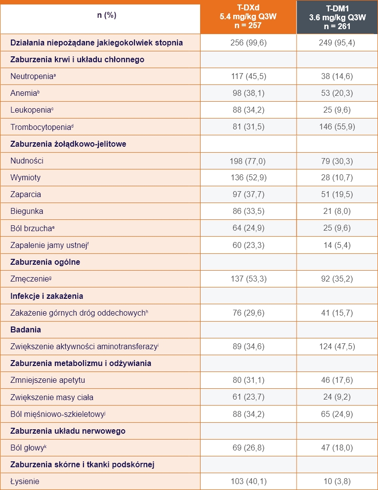Całkowita częstość występowania śródmiąższowej choroby płuc/nieinfekcyjnego zapalenia płuc wynosiła 16,7% w grupie leczonej DXd oraz 3,4% w grupie leczonej T-DM1.