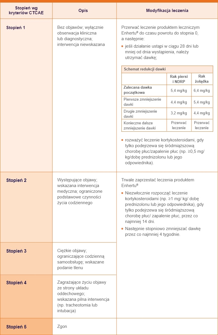 Nie zaobserowano zdarzeń uznanych za śródmiąższową chorobę płuc/nieinfekcyjne zapalenie płuc związanych ze stosowaniem leku Enhertu w nasileniu 4. lub 5. stopnia.