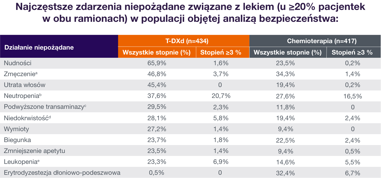 Ogólny odsetek działań niepożądanych związanych z lekiem stopnia ≥3 wynosił 40,6% przy zastosowaniu T-DXd i 31,4% przy zastosowaniu chemioterapii2
