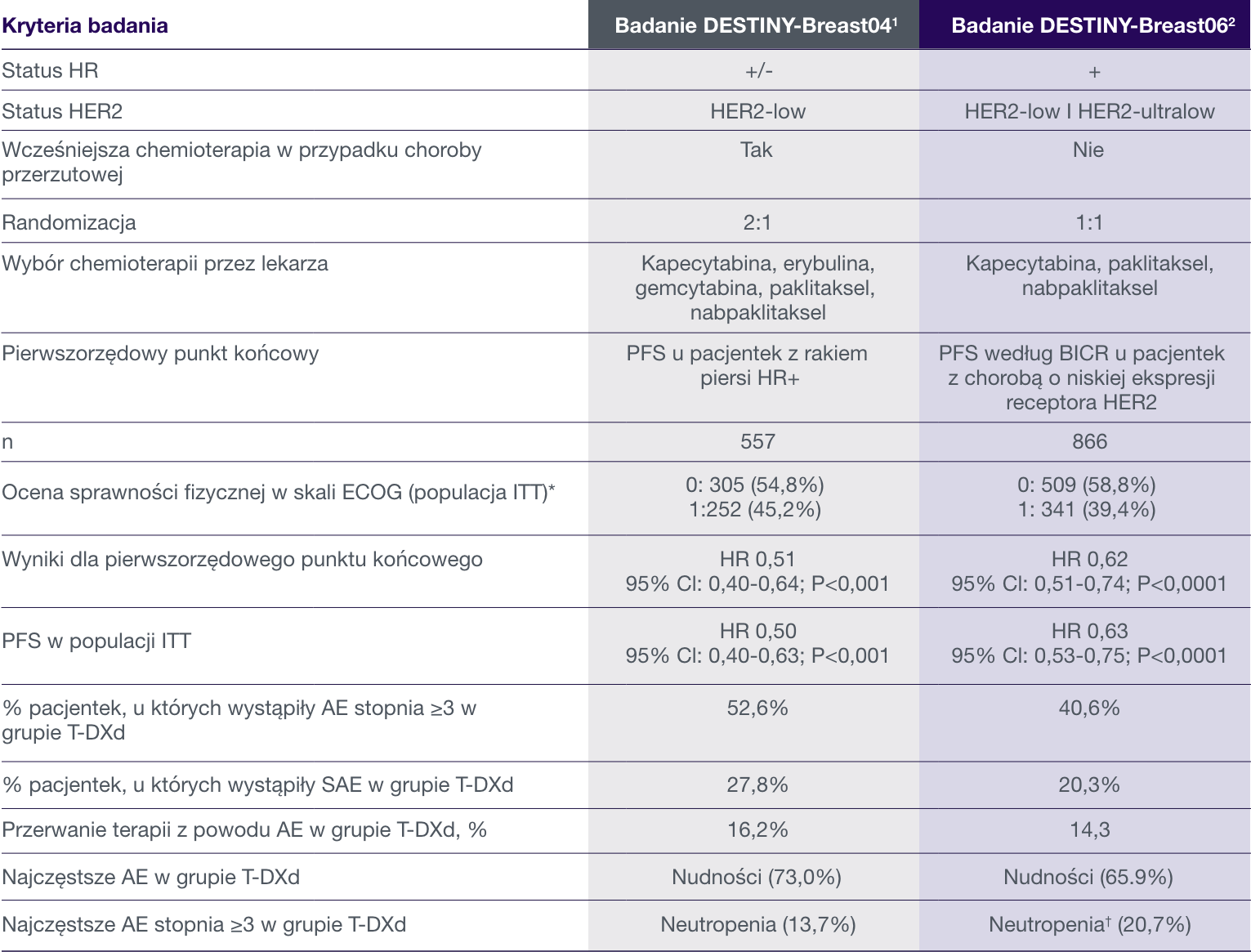 1. Bardia A, Hu X, Dent R, i wsp.; DESTINY-Breast06 Trial Investigators. Trastuzumab deruxtecan after endocrine therapy in metastatic breast cancer. N Engl J Med. 2024. doi:10.1056/NEJMoa2407086 2. Bardia A, Hu X, Dent R, i wsp.; DESTINY-Breast06 Trial Investigators. Supplement to: Trastuzumab deruxtecan after endocrine therapy in metastatic breast cancer. N Engl J Med. 2024. doi:10.1056/NEJMoa2407086 aObejmuje zmęczenie, osłabienie, złe samopoczucie i senność. bObejmuje obniżoną liczbę neutrofili i neutropenię. cObejmuje podwyższenie aktywności aminotransferaz, podwyższenie aktywności aminotransferazy asparaginianowej, podwyższenie aktywności aminotransferazy alaninowej, podwyższenie aktywności gamma-glutamylotransferazy, nieprawidłowy wynik testu czynności wątroby i podwyższony wynik testu czynności wątroby. dObejmuje zmniejszenie stężenia hemoglobiny, zmniejszenie liczby czerwonych krwinek, niedokrwistość i spadek hematokrytu. eObejmuje zmniejszenie liczby białych krwinek i leukopenię.