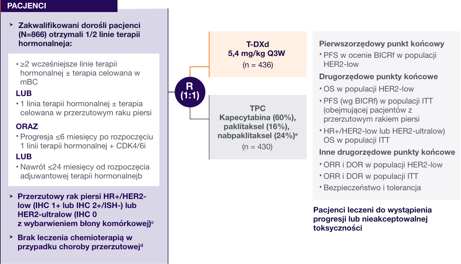 1.Bardia A, Hu X, Dent R, i wsp.; DESTINY-Breast06 Trial Investigators. Trastuzumab deruxtecan after endocrine therapy in metastatic breast cancer. N Engl J Med. 2024. doi:10.1056/NEJMoa2407086 *Populacja z niską ekspresją receptora ludzkiego naskórkowego czynnika wzrostu (ang. human epidermal growth factor receptor 2, HER2) obejmowała pacjentów z niską ekspresją HER2 określaną na podstawie wyniku badania immunohistochemicznego (ang. immunohistochemical, IHC) wynoszącego 1+ lub 2+ oraz ujemnych wyników badania metodą hybrydyzacji in situ (ang. in situ hybridization, ISH). Populacja wyodrębniona zgodnie z zaplanowanym leczeniem obejmowała wszystkich zrandomizowanych pacjentów. W populacji z ultraniską ekspresją HER2 znalazły się pacjentki z ultraniską ekspresją HER2 określaną jako wynik IHC 0 z wybarwieniem błony komórkowej. Status niskiej i ultraniskiej ekspresji HER2 określano zgodnie z danymi pochodzącymi z laboratorium centralnego. Ze względu na błędy stratyfikacyjne łączna liczebność próby obejmująca obie populacje nie odpowiada liczbie chorych w populacji wyodrębnionej zgodnie z zaplanowanym leczeniem. Dwie pacjentki błędnie przypisano do populacji wyodrębnionej zgodnie z zaplanowanym leczeniem (po 1 do każdej grupy leczenia). Po przeprowadzeniu badań w laboratorium centralnym stwierdzono u nich HER2 IHC 0 bez wybarwienia błony komórkowej. Jedna pacjentka pierwotnie zakwalifikowana do populacji z ultraniską ekspresją HER2 została przypisana do populacji z niską ekspresją HER2 na podstawie wyniku oceny uaktualnionej biopsji (materiał oceniony w momencie przesiewu pobrano przed wystąpieniem choroby przerzutowej). Tym samym wspomniana pacjentka nie została uwzględniona w analizie populacji z ultraniską ekspresją HER2 ani w analizie pierwotnej populacji z niską ekspresją HER2; jej dane włączono do populacji wyodrębnionej zgodnie z zaplanowanym leczeniem. Schemat chemioterapii wybierał lekarz prowadzący spośród kapecytabiny, paklitakselu w postaci nanocząsteczkowego kompleksu z albuminą oraz paklitakselu. Wartości procentowe po zsumowaniu nie pozwalają uzyskać 100, co jest wynikiem zaokrąglenia. CDK4/6 oznacza kinazę zależną od cyklin 4 i 6. † Rasa była podawana przez pacjentów. ‡ Ocena stanu sprawności wg Eastern Cooperative Oncology Group (ECOG) jest wykonywana na 5-punktowej skali, gdzie wyższe oceny oznaczają większą niepełnosprawność. Łącznie u 14 pacjentów w populacji wyodrębnionej zgodnie z zaplanowanym leczeniem (5 pacjentek w grupie trastuzumabu derukstekanu i 9 chorych w grupie chemioterapii) nie miało informacji na temat stanu sprawności wg ECOG w punkcie wyjściowym; w ich przypadku wynik 0 lub 1 udokumentowano w ciągu 6 dni po przeprowadzeniu randomizacji. § Pierwotną oporność na leczenie hormonalne definiowano jako wystąpienie nawrotu choroby w ciągu pierwszych 2 lat od momentu rozpoczęcia hormonoterapii uzupełniającej lub wystąpienie progresji choroby w ciągu pierwszych 6 miesięcy od momentu rozpoczęcia leczenia hormonalnego pierwszej linii z powodu raka piersi z przerzutami. ¶ Z badania wyłączono pacjentów z klinicznie aktywnym przerzutem do ośrodkowego układu nerwowego (OUN) (określanym jako nieleczona choroba, choroba powodująca objawy lub wymagająca leczenia glikokortykosteroidami bądź lekami przeciwdrgawkowymi w celu kontroli objawów podmiotowych). ∂Dowolne leczenie hormonalne obejmowało leczenie podawane w monoterapii lub leczenie skojarzone. ** Inne leki celowane stosowane w grupach trastuzumabu derukstekanu i chemioterapii w populacji wyodrębnionej zgodnie z zaplanowanym leczeniem obejmowały inhibitory mTOR (ang. mammalian target of rapamycin) (stosowane u 23,9% chorych w grupie trastuzumabu derukstekanu i u 23,7% w grupie chemioterapii), inhibitory kinazy fosfoinozytydu 3 (odpowiednio u 5,5% i 2,8%) lub inhibitory polimerazy poli-adenozynodifosforanu rybozy (odpowiednio u 0,7% i 1,2% chorych).