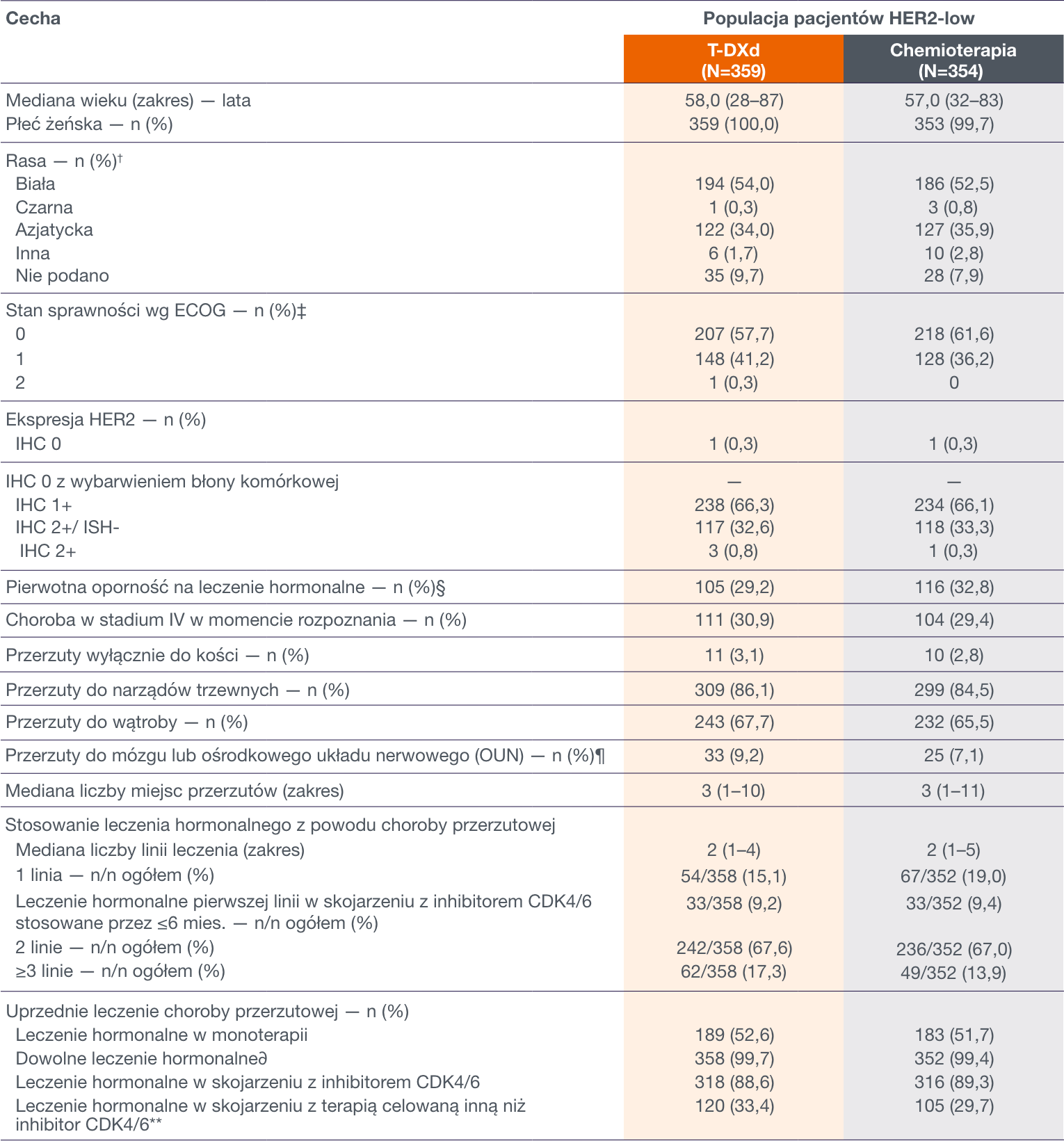DESTINY-Breast06: Wyjściowa charakterystyka kliniczna pacjentów HER2-low1