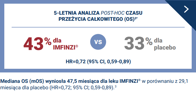 *5-letnią analizę post-hoc czasu przeżycia całkowitego (OS) przeprowadzono po około 5 latach od randomizacji ostatniego chorego i nie miała ona odpowiedniej mocy, aby wykazać istotność statystyczną. Mediana OS wyniosła 47,5 miesiąca dla leku IMFINZI® (95% CI, 38,1-52,9) w porównaniu z 29,1 miesiąca dla placebo (95% CI, 22,1-35,1). Redukcja ryzyka zgonu u chorych otrzymujących lek IMFINZI® w porównaniu z placebo wyniosła 28% (HR=0,72; 95% CI, 0,59-0,89). Wskaźniki OS dla leku IMFINZI® w porównaniu z placebo wyniosły odpowiednio: 83,1% (95% CI, 79,4-86,2) vs 74,6% (95% CI, 68,5-79,7) po 12 miesiącach, 66,3% (95% CI, 61,8-70,4) vs 55,3% (95% CI, 48,6-61,4) po 24 miesiącach, 56,7% (95% CI, 52,0-61,1) vs 43,6% (95% CI, 37.1-49,9) po 36 miesiącach, 49,7% (95% CI, 45,0-54,2) vs 36,3% (95% CI, 30,1-42,6) po 48 miesiącach i 42,9% (95% CI, 38,2-47,4) vs 33,4% (95% CI, 27,3-39,6) po 60 miesiącach.3